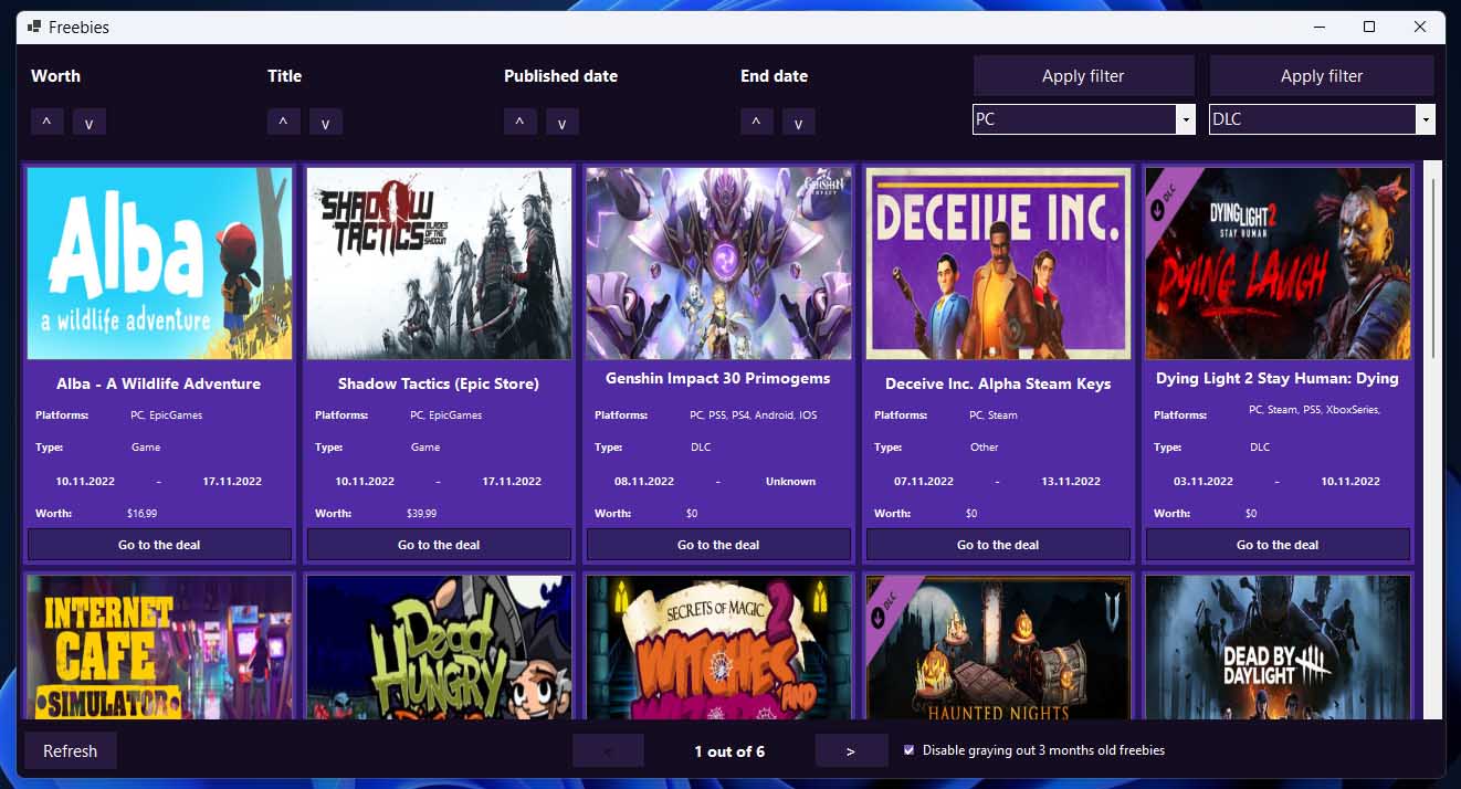 Project of an windows forms application getting data about free games, dlcs etc. from gamerpower.com API and converting it into simple but working interface with cards having informations about freebies. Click image for more info!
