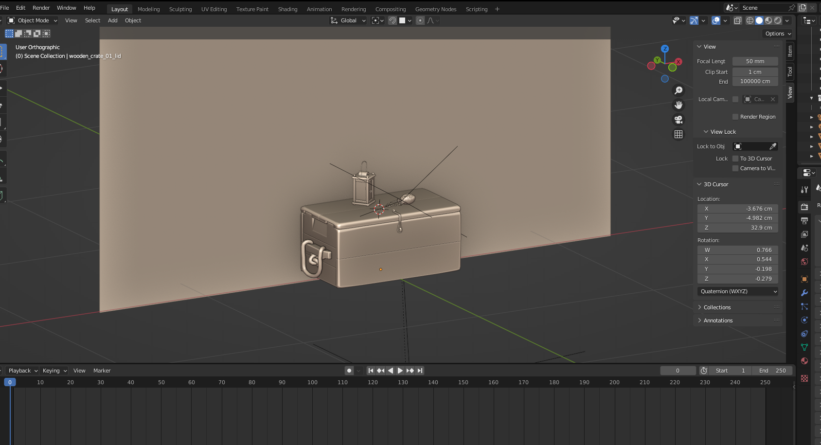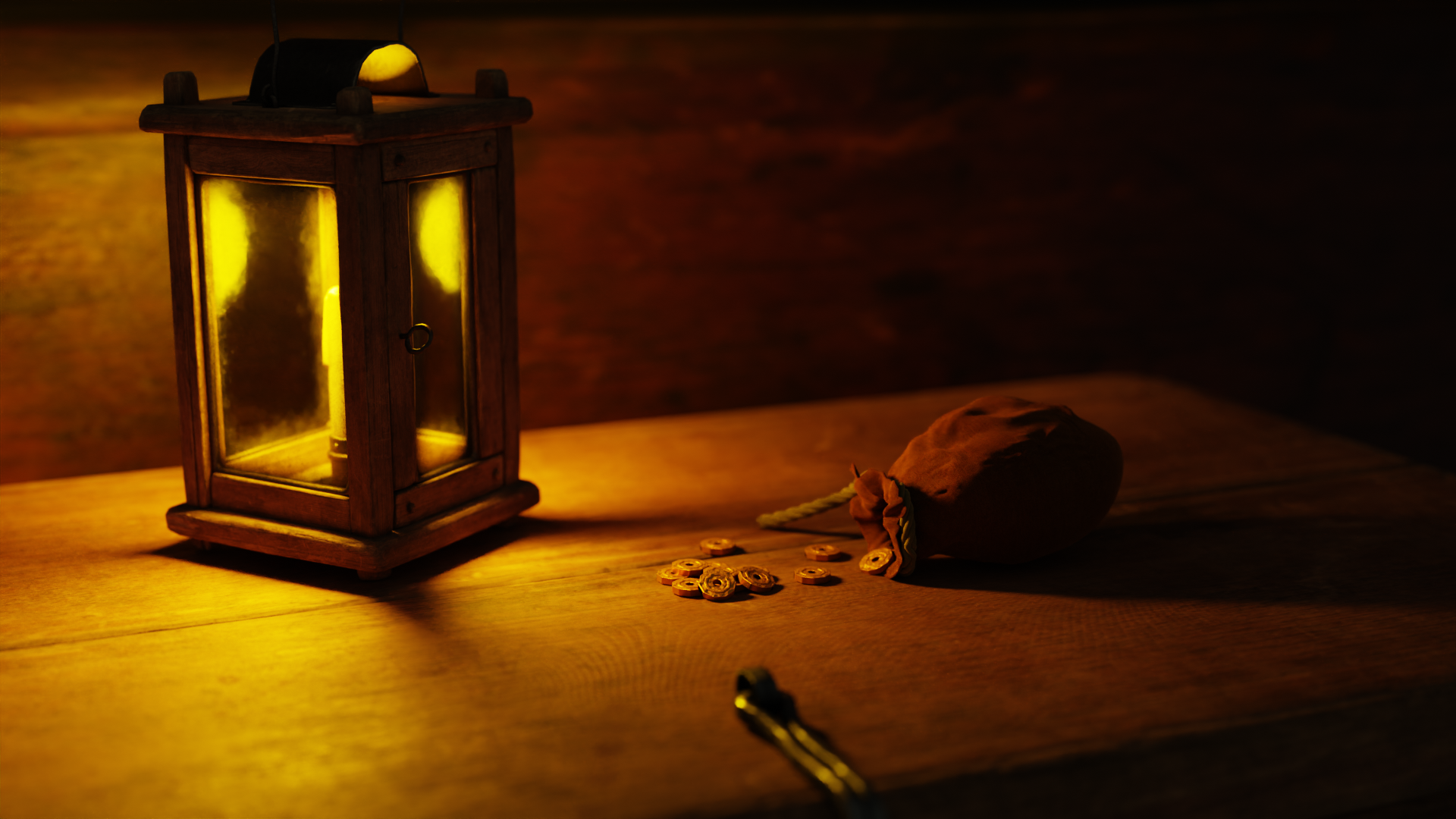 In this project i wanted to create bag of coins. I used physics simulation and pressure stuff in Blender to create the bag that seems at least a little bit beliveable to be real. The rope was made using Bezier Curve and some modifiers. Lamp and chest were from website that i can't remember now, but were free to use, I only added light to the lamp.